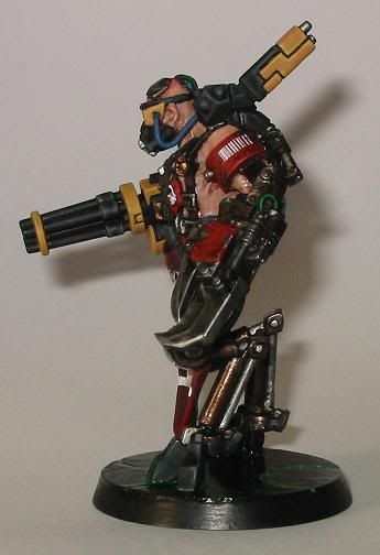 I can't say that I like the legs (they look a bit spindly, and the necessarily huge feet really add to this problem,) but all in all, I think that it is a great conversion. I really like the use of bits (Sgt. Stone's arm with the burst cannon, and the Terminator face mask and Tau optics on the head in particular.)