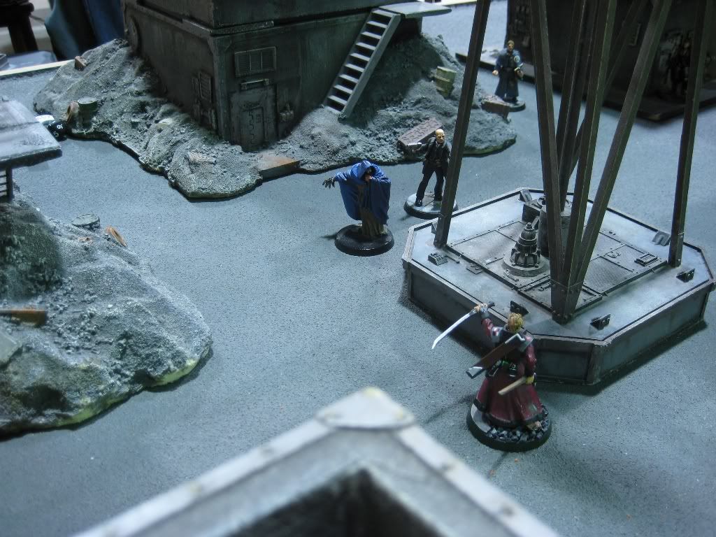 Kaled moved straight towards the location of the information (the top of a tall building on the other side of the map), the Chief followed him while Stormtrooper Caine moved into the centre of the board. Excus and X22, his servitor, moved forwards encountering Caine who demanded they withdraw as the area was under Inquisitorial jurisdiction, and the pair appeared to leave. Hoping to decoy the intruders, the Chief moved towards one of the other possible locations of the data.