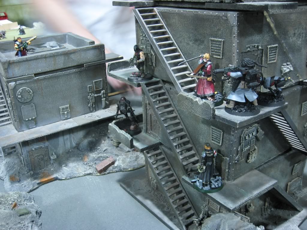 Excus saw Kaled and moved towards the same building, while his servitor lumbered slowly towards the central platform. Rex ran towards the central platform jumped and clambered up a chute. Sophus moved into the centre of the board and Tank moved to take up a firing position on a nearby building. Caine clambered to his feet and moved to investigate the noise coming from the chute, while Kaled made it to the top of the building he was climbing and the ogryn started up the stairs. Excus had some diffuculty climbing the outside of the building, while the servitor was still slowly lumbering towards the central platform.