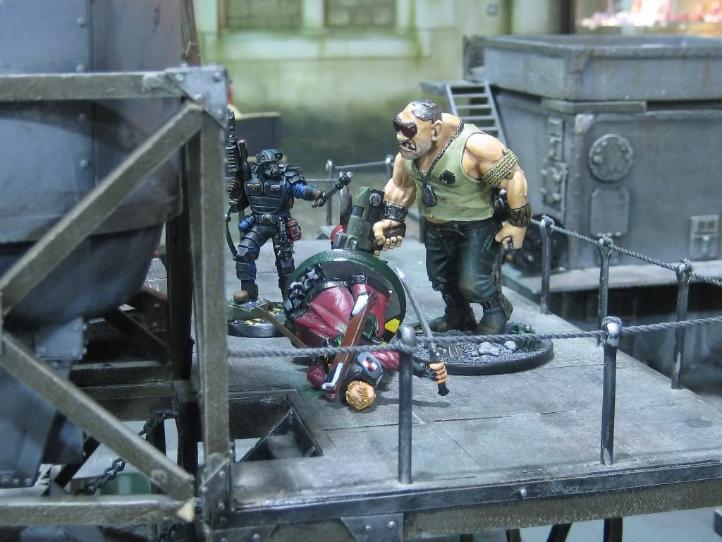 Rex jumped to his feet and attacked Caine. The ogryn moved to join the fight but wasn't in time to prevent Rex's nimble swordsmanship wounding the stormtrooper several times. Tank opened up on the Ogyrn with his heavy stubber, knocking him off his feet. Kaled, having seen his elite trooper cut down blasted Rex with his bolt pistol. Caine dragged himself to his feet, and wary of getting too close to Rex, fired a couple of shots into his prone figure. By now the ogryn was angry! He charged over to Rex, stomped on his chest and then hurled him off the side of the platform for good measure.