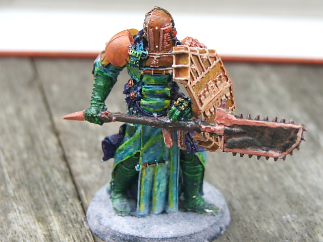 I made this model for the 2009 hobby competition, mostly built round the concepts of the shield and chain halberd, using the Thorian inquisitor as base. The shield is made of weapon panels for BFG, and the halberd is sergeant Stone's, spare lizardman handweapons providing the chainblade.