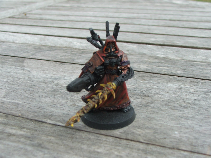 Yes, I realise that's a lot of armour and firepower, as befits the 'practical' element of his character. Mostly, he's inquisitor Tyrus without the ridiculously ornate shoulder plates, and with the other decoration green-stuffed over to give a more austere, utilitarian feel. Not too happy with the paint job. Black armour is hard to make interesting.