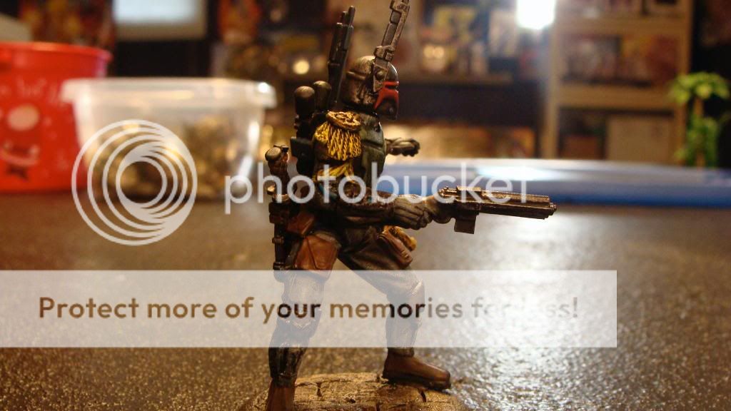I do have to agree with the others however about fett, his head looks a bit to distinctive for me. You could try and use green stuff to separate the horizontal and vertical sections of the helmet (where the bridge of his nose would be) for a bit more of a distinct feel. Also adding some tau optics could help and add to the character at the same time.