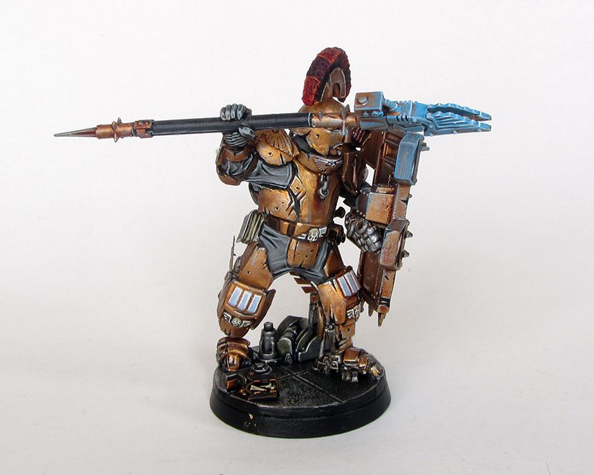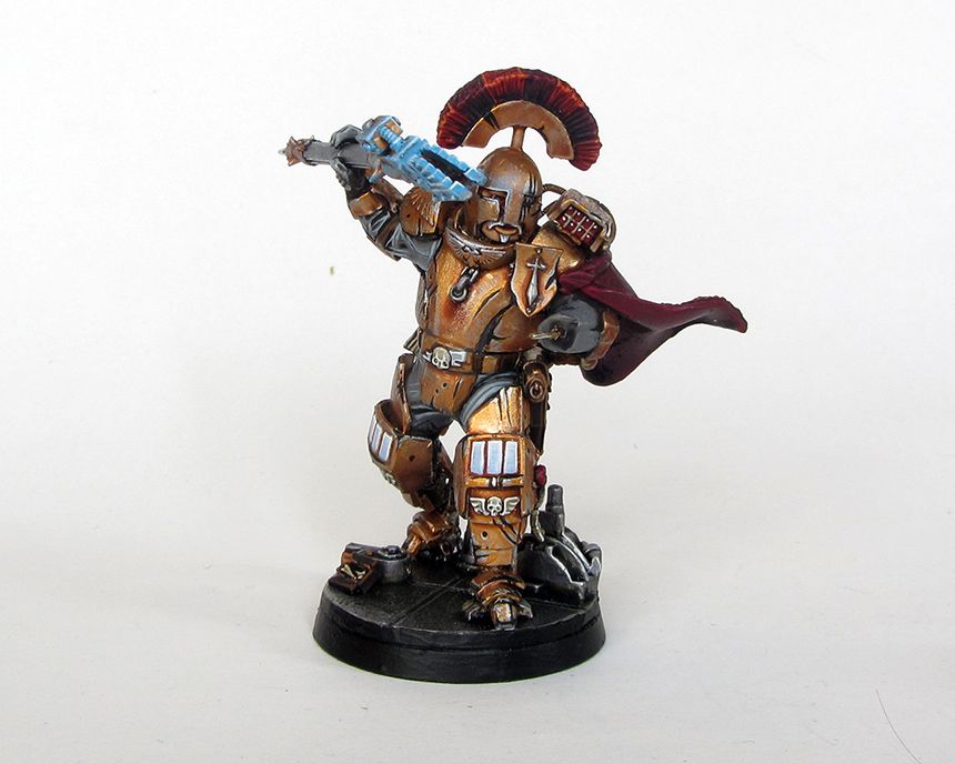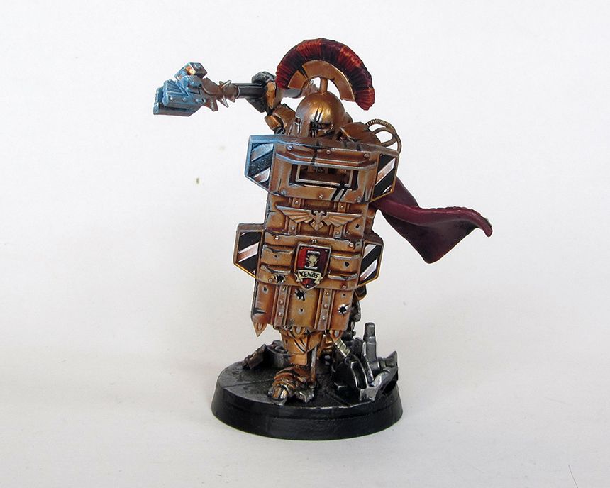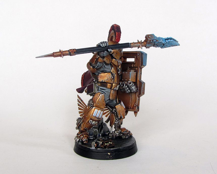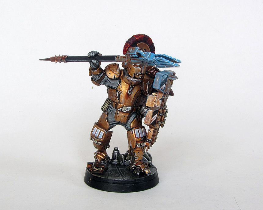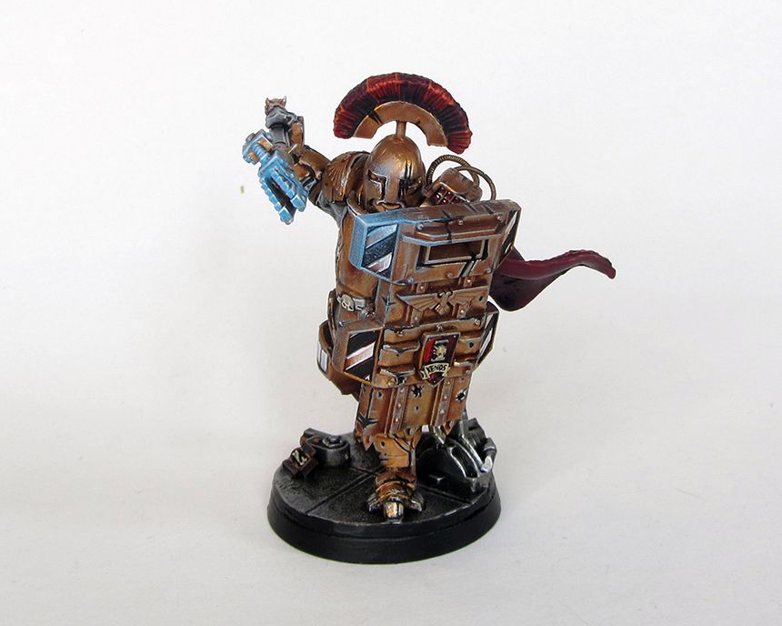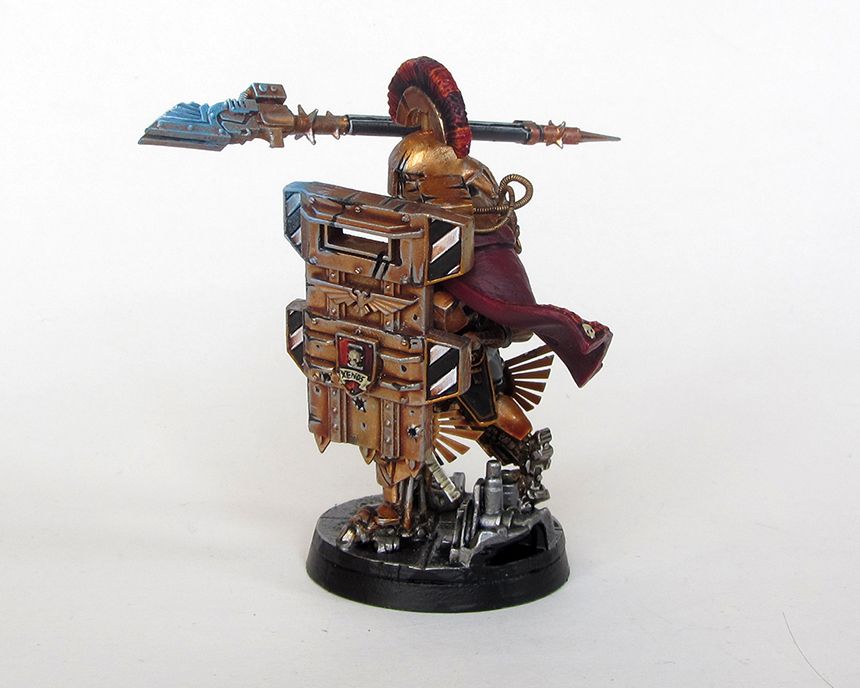 Yeah the main one is the Adeptas 'I' with a clenched fist in the centre. I had thought about incorporating it into the design but I didn't for whatever reason. The bronze colour is the armour colour from his precinct on a very sunny planet. I figured they would polish up their armour so they would reflect as much light as possible to be both a literal shining example of Imperial law and to bedazzle any perps who want to try their luck. Next arbitrator will definitely be more black however!